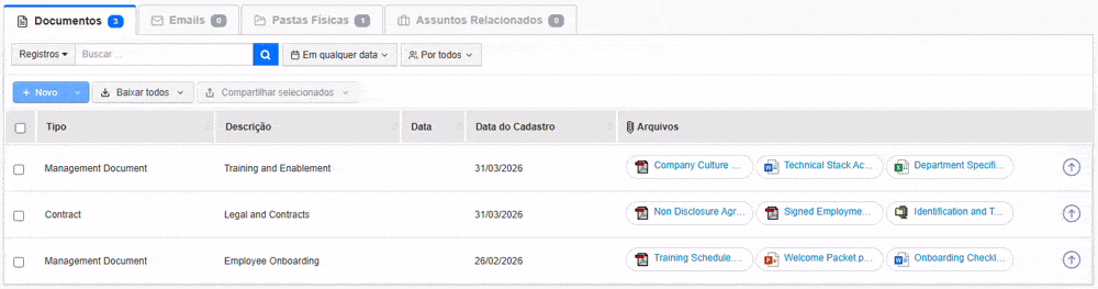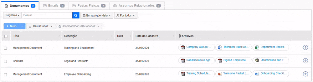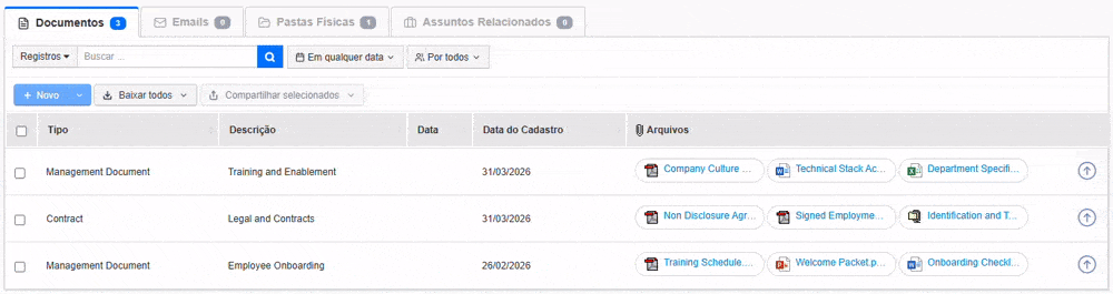 Já em registros agrupadores (como empresas, assuntos ou caixas), a ferramenta é ainda mais poderosa: você seleciona qual tipo de item deseja baixar daquele grupo e a plataforma organiza automaticamente o pacote para download. Precisa de todos os documentos daquela empresa? Ou prefere todas as pastas? Basta selecionar o tipo desejado e fazer o download de uma só vez.