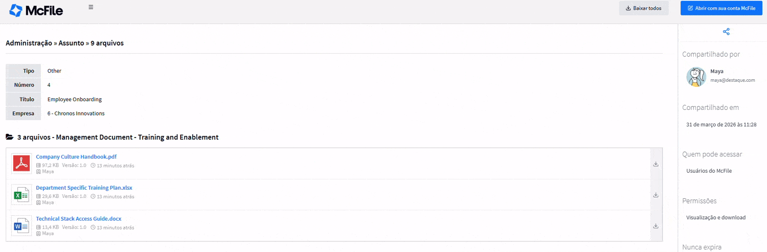 Esqueça a tarefa cansativa de baixar arquivo por arquivo. Com o download em lote da McFile, você ganha produtividade ao baixar todos os arquivos de um registro com apenas um simples clique, rápido e pensado para otimizar seu fluxo de trabalho.