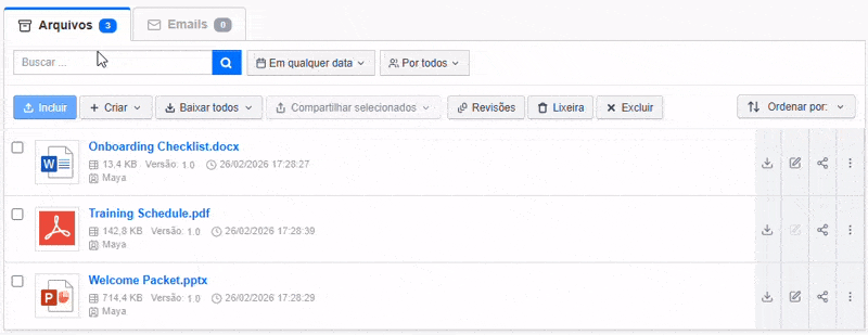 Você encontra a opção de download em lote diretamente nas telas de registro. Em registros básicos, como documentos e pastas, a McFile baixa todos os arquivos que estão ali.