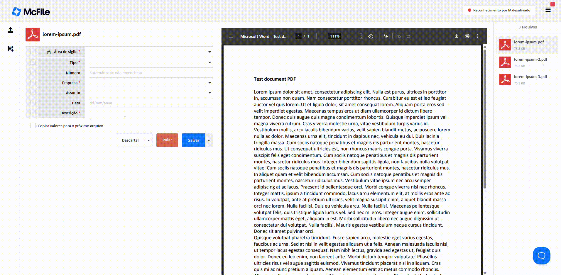 Com essa nova funcionalidade, preencher metadados de documentos torna-se prático e eficiente. Dessa forma, você digita menos e produz mais! Caso ainda não seja um cliente, experimente o McFile gratuitamente e conheça na prática como a plataforma pode transformar seu negócio.