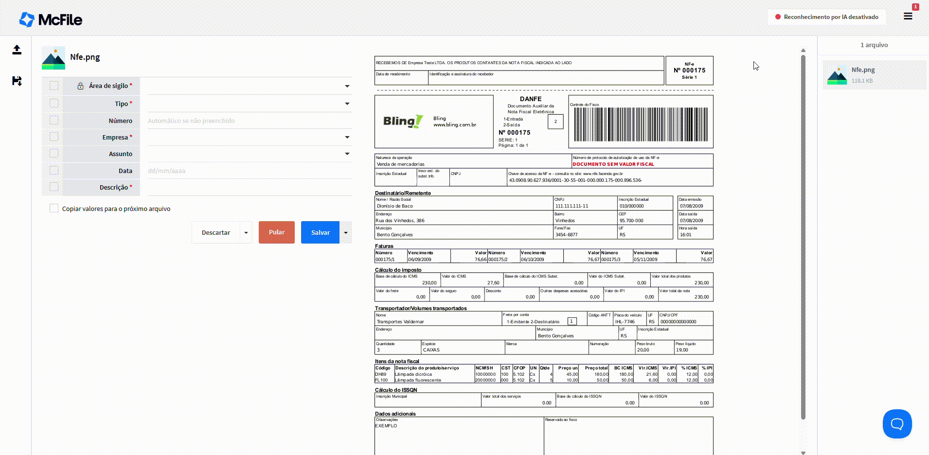Com o reconhecimento por Inteligência Artificial, em poucos cliques, dados relevantes são preenchidos automaticamente. Selecione o tipo de documento que atenda à sua necessidade. Atualmente disponibilizamos o reconhecimento de notas fiscais que preenche automaticamente o número da nota, Empresa emissora (ou receptora) e Data de Emissão.