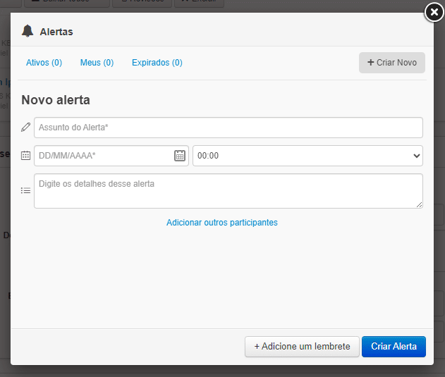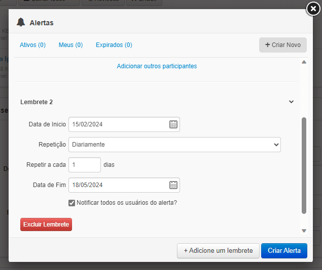 Depois de preencher os campos obrigatórios de Assunto e Data, você pode clicar na opção “+ Adicione um lembrete” para adicionar avisos periódicos acerca de seu alerta.