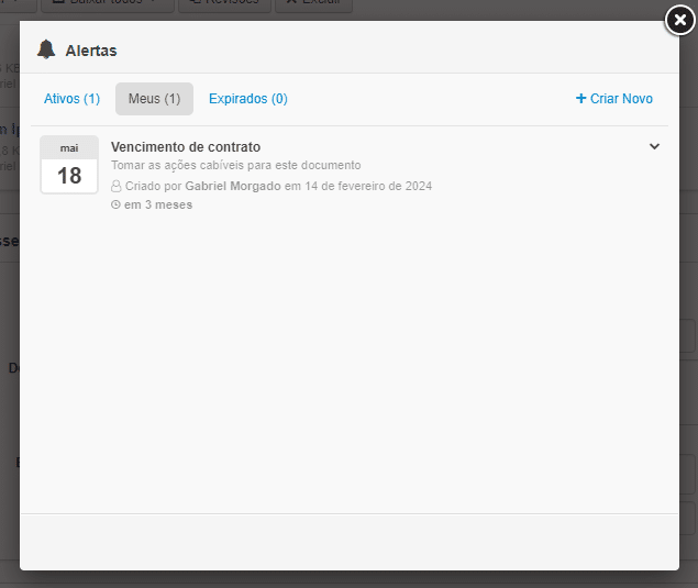 É também nesse menu que você confere a lista dos alertas ativos para o registro que você está visualizando. Eles são separados em alertas ativos – os que ainda irão ocorrer, alertas criados por você e alertas expirados – os quais já foram realizados.